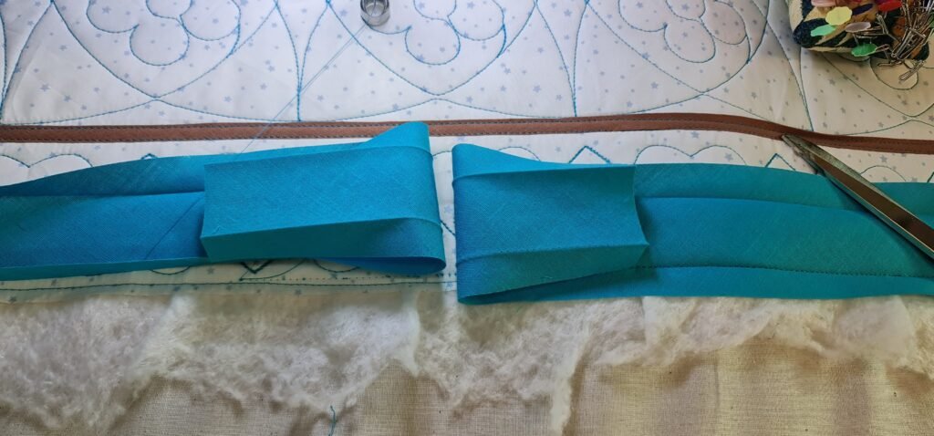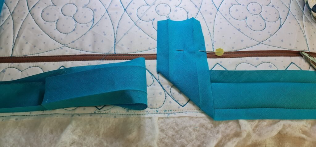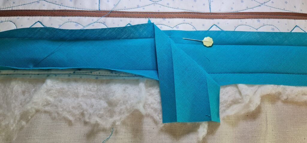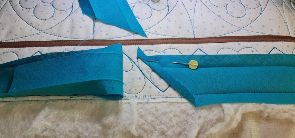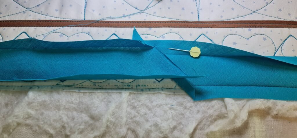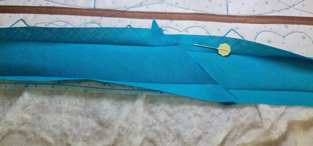 Te queda un bies perfectamente unido, quita la colcha del bastidor y recorta por el borde del bies, asi entregarás un trabajo limpio, preparado para que la clienta cosa a puntada escondida