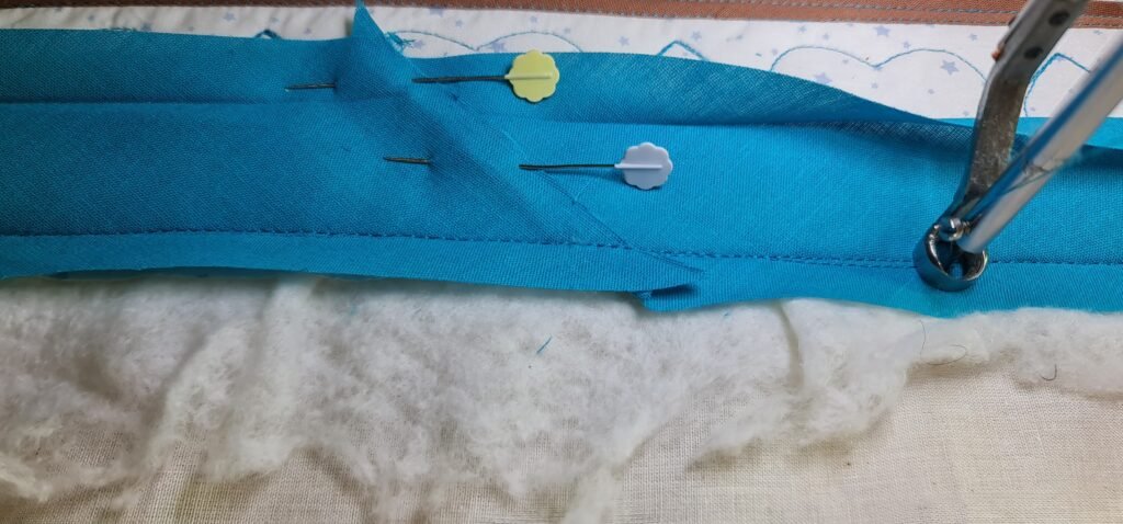 Para coser el bies, coloca la tira en la máquina long arm y asegúrate de utilizar la regla adecuadamente. Coser con regla te permitirá obtener un una costura recta y precisa una unión bien hecha. Una vez que hayas cosido la tira de bies, completa el proceso de acuerdo con las instrucciones visuales. Termina asegurando la unión como se muestra en las fotos, lo que garantiza que tu quilt luzca impecable.